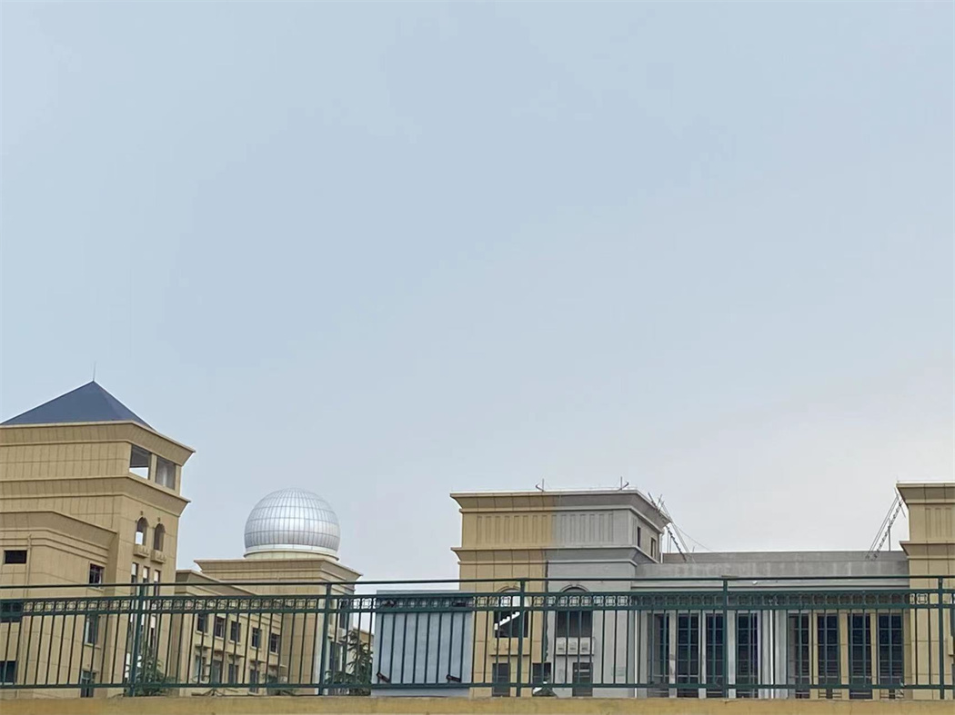 淮北中學(xué)天文臺,在樓頂搭建一座2.5米高房子,雙層結(jié)構(gòu),外板采用鋁塑板,內(nèi)板采用微孔鋁板,中間有吸音棉,一樓鋪設(shè)地磚,二樓鋼結(jié)構(gòu),鋼平臺大梁小梁采用矩形管,定制望遠鏡基座,用于后期放置望遠鏡用,制作順墻弧形鋼梯,扶手采用市場專用扶手,美觀、牢固。上層配備9米經(jīng)典式天文圓頂,外殼光滑,具備抗腐蝕,防銹,密封防塵好,不漏雨,也是天文觀測的標志性建筑,經(jīng)典型天文圓頂古典美麗,是大眾認知度很高的一種天文建筑。